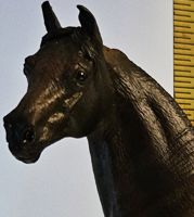 things to note about the figure: this is one of the more expressive models, espeically for this breed. the head is slightly tilted to show the inquisitive and attentive nature. the eyes and the nose have a gloss over them to make the figure look more realistic. this model is handpainted, shown where the mane lays on the neck, however, this isn't as evident due to the dark bay coloring on the body. for the most part, the scuplt is good, the body is compact, the head is refined. but it does seem like the nostrils do not line up and i am unsure if that is just an issue with mine or if this flaw is throughout the run of the model. additionally, my figure's feet do not all touch the ground when placed flat, so it does lean to the side. while this is usual with thin four-legged animals, it is still techincally a flaw.-the pose makes the horse seem like it is ready for whatever work is needed, which is true of the highly versatile morgan breed. the bay is a deep brown color - a bit difficult to photograph. 7/10.